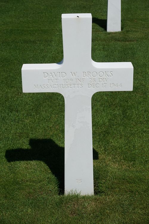 Pvt David W. Brooks attended Massachusetts State College and was employed by Smith & Wesson.He enlisted in Springfield, Massachusetts on 4 January 1944 and was sent overseas in August 1944.