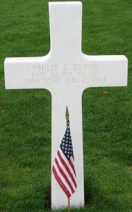 Pvt Philip J. Byrne attended high school for three years and was a shipping clerk before he enlisted at Camp Upton, New York on 9 June 1944.Source of information: Leo Minne, www.abmc.gov, www.wwiimemorial.com, www.ancestry.com - Headstone and Interment Record / 1930/1940 Census / U.S. WWII Hospital Admission Card Files / U.S. Draft Cards Young Men, www.80thdivision.com