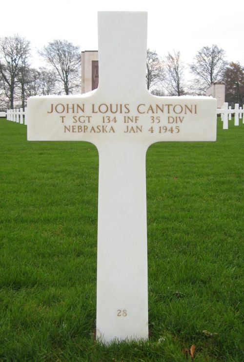 T/Sgt John L. Cantoni attended Creighton University before he joined the National Guard in Omaha, Nebraska on 23 December 1940. He was sent overseas in May 1944.He was killed by a direct artillery shell hit on his foxhole.