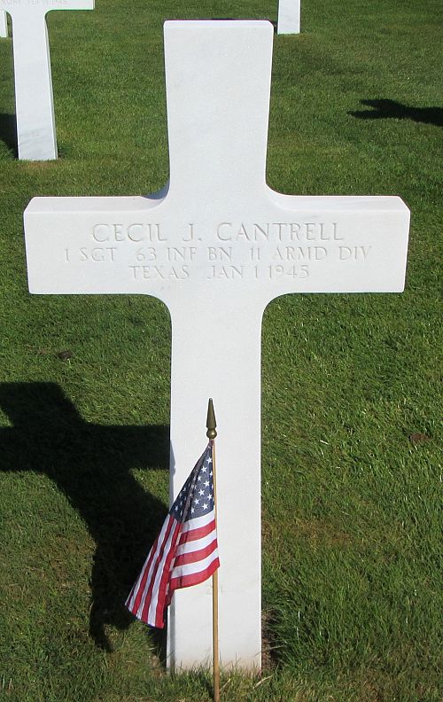 1st Sgt Cecil J. Cantrell attended Mexia High School for two years and worked in an oil refinery.He was awarded the Silver Star medal posthumously. The citation reads: On 31 December 1944, near ******, Sgt Cantrell's company became exposed to very heavy enemy artillery and mortar fire, which inflicted numerous casualties. Throughout the heavy concentration of fire, Sgt Cantrell, with utter disregard of personal safety, moved across the entire area, administering first aid to the wounded. On 1 January 1945, when committed to an attack, his company was pinned down by heavy sniper fire. Sgt Cantrell, again displaying unflinching courage, walked forward in the face of the fire to a position where he observed two enemy snipers in foxholes. With rapid action, he fired at the snipers and killed them. He then returned and informed his company commander that the enemy was entrenched to their immediate front. While reporting to his company commander, Sgt Cantrell was fatally wounded by sniper fire. The fearless devotion to duty, conscious heroism and the remarkable leadership displayed by Sgt Cantrell was in keeping with the highest traditions of the Armed Forces of the United States.