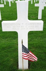 Pfc Anderson T. Carpenter was a driver for the Houston Brick and Tile Company before he enlisted in Houston, Texas on 5 January 1944.He was first buried at the Temporary American Military Cemetery in Grand Failly, France.