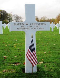 Pfc Martin W. Chelstrom enlisted on 16 October 1940. He joined the 11th Infantry Regiment at Fort McClellan, Calhoun, Alabama in January 1943.Source of information: Leo Minne, www.abmc.gov, www.wwiimemorial.com, www.archives.gov – WWII Enlistment Record, www.ancestry.com - 1930/1940 Census / Headstone and Interment Record 1942-1949 / Mc Vean Family Tree / U.S. Draft Cards Young Men, www.findagrave.com, A footsoldier for Patton / Michael C. Bilder James G. Bilder, The 5th Infantry Division in the ETO
