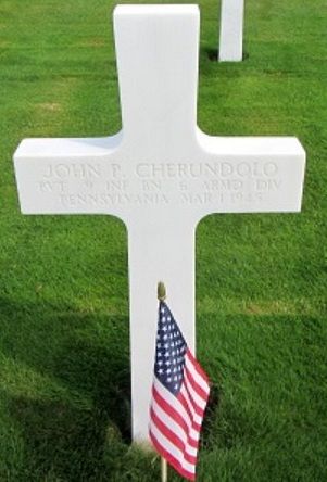 Pvt John P. Cherundolo graduated from Old Forge High School. He graduated from the University of Scranton in 1943 and was a foreman before he enlisted in Wilkes Barre, Pennsylvania on 24 July 1944. He was sent overseas in January 1945.Source of information: Peter Schouteten, www.abmc.gov, www.wwiimemorial.com, www.archives.gov – WWII Enlistment Record, www.ancestry.com - Headstone and Interment Record / Hartman Family Tree / Pennsylvania Veteran Compensation Application Files WWII / U.S. WWII Draft Cards Young Men / 1930 Census, www.findagrave.com, www.newspapers.com – The Tribune 9 April 1945, www.super6th.org