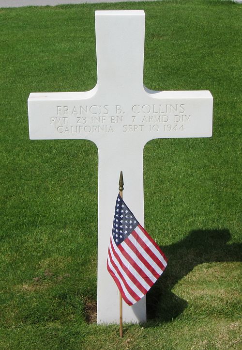 Pvt Francis B. Collins enlisted in Los Angeles, California on 1 July 1943.Source of information: André Koch, www.abmc.gov, www.wwiimemorial.com, www.archives.gov - WWII Enlistment Record, www.ancestry.com - Headstone and Interment Record / 1920/1930/1940 Census / U.S. WWII Draft Cards Young Men 1940-1947 / California County Birth Marriage and Death Records 1849-1980, https://www.7tharmddiv.org