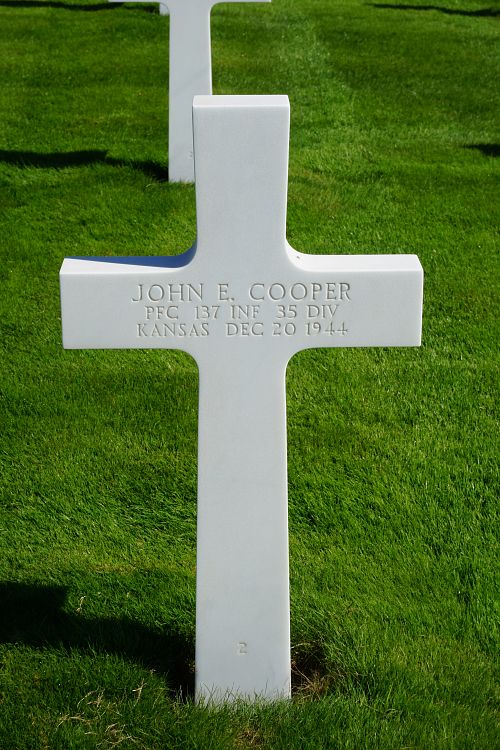 Pfc John E. Cooper was a shoemaker and shoe repairman before he joined the National Guard in Emporia, Kansas on 23 December 1940. He was sent overseas in May 1944.Pfc Cooper was killed when an artillery shell struck a tree and exploded, right above his foxhole.