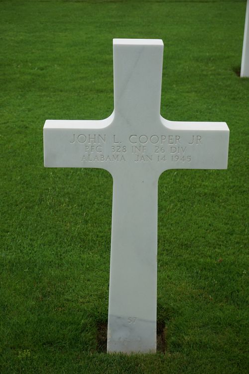 Pfc John L. Cooper Jr. attended New Hope High School for four years and was employed by the Birmingham Slag Company before he enlisted on 29 March 1944. He was sent overseas in October 1944.He was killed by shrapnel wounds in the neck and shoulder.