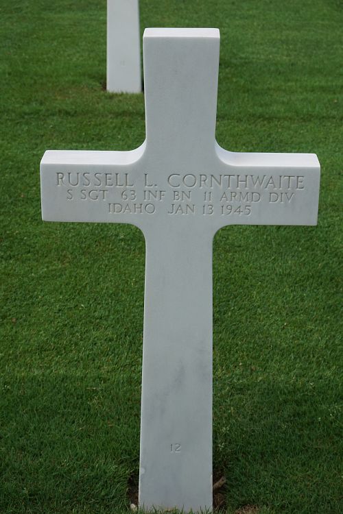 S/Sgt Russell L. Cornthwaite enlisted in Boise, Idaho on 14 October 1942. He was sent overseas in October 1944.Source of information: André Koch, www.abmc.gov, www.wwiimemorial.com, www.archives.gov - WWII Enlistment Record, www.ancestry.com - Headstone and Interment Record / 1930/1940 Census / U.S. WWII Draft Cards Young Men 1940-1947, http://www.11tharmoreddivision.com
