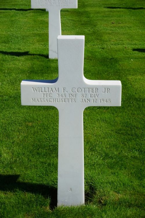 Pfc William F. Cotter volunteered for the U.S. Army Reserve at Fort Devens, Massachusetts on 16 December 1943.He was first buried at the Temporary American Military Cemetery in Grand Failly, France.