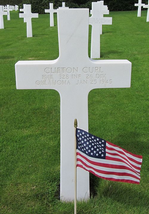 Pvt Clifton Curl attended high school for two years and was a carpenter with L. Hastic before he enlisted in Oklahoma City, Oklahoma on 21 July 1944.He was killed by artillery shell fragments to his skull.