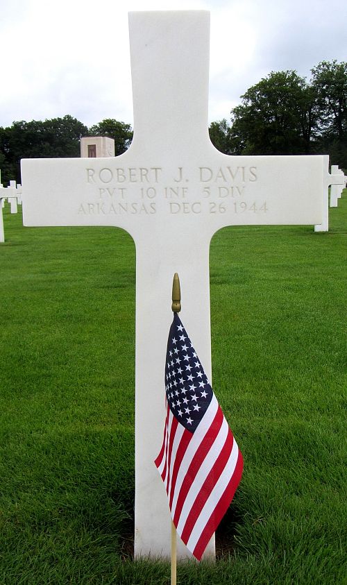 Pvt Robert J. Davis was a railroad section hand before he enlisted.Source of information: Leo Minne, www.abmc.gov, www.wwiimemorial.com, www.archives.gov – WWII Enlistment Record, www.ancestry.com - 1930/1940 Census / Headstone and Interment Record 1942-1949 / O’Neill Family Tree, A footsoldier for Patton / Michael C. Bilder James G. Bilder, The 5th Infantry division in the ETO