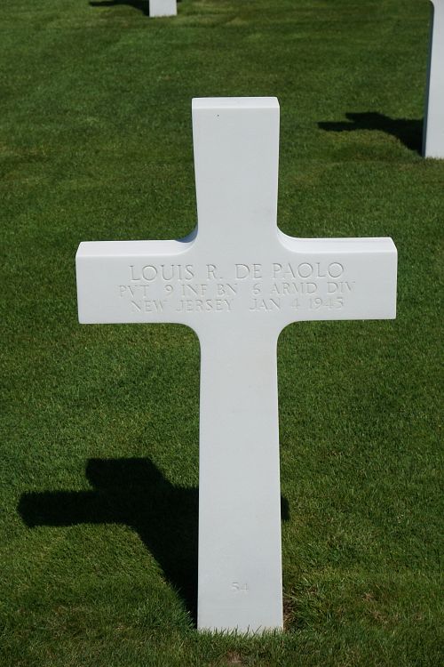 Pvt Louis R. F. De Paolo was employed by the Arlington Engineering Company before he enlisted in September 1944.He was first buried at the Temporary American Military Cemetery in Grand Failly, France.