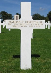 Pfc Marijan P. Derencin Jr. enlisted in Altoona, Pennsylvania, on 30 April 1942.He attended high school for 4 years and was a driver before he enlisted.
