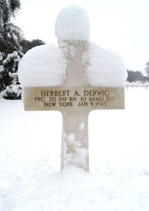 Pfc Herbert A. Derwig attended college for one year and was employed at the post office before he joined the Regular Army in Cleveland, Ohio on 12 December 1942 and went overseas in September 1944.1st Lt. Alex Andros recalls: As they moved closer toward its final objective at Cobru they passed through several open areas, as medic Johnny Gibson remembers. The group I was working with stopped along a small track on the edge of a wood to let a jeep pass by. Moving slowly through the snow, the vehicle struck a landmine with its left front wheel and parts of the engine and dashboard hit the driver in the chest. I was 40 ft away and went over to help. Moments later, the driver, whose name was Herbert A. Derwig, died.