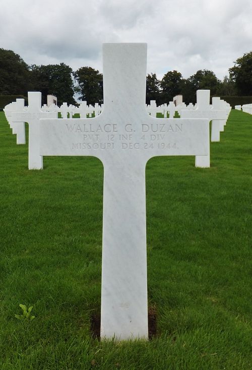 Pvt Wallace G. Duzan attended high school for 3 years before he enlisted at Jefferson Barracks, Missouri on 27 October 1943.He was first buried at the Temporary American Military Cemetery in Grand Failly, France.