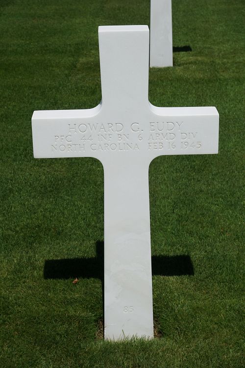 Pfc Howard G. Eudy attended high school for one year and was a barber before he enlisted at Fort Bragg, North Carolina on 20 February 1943.He was seriously wounded on 10 February and died to the effects of artillery shell fragments on 16 February 1945.