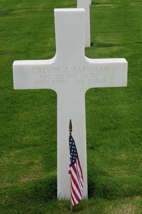 Pfc Calvin J. Farnham attended high school for four years and worked on his own farm before he enlisted at Fort Dix, New York on 29 Apil 1944.He is also remembered at the Sunset Hill Cemetery in Lakewood, Chautauqua County, New York.