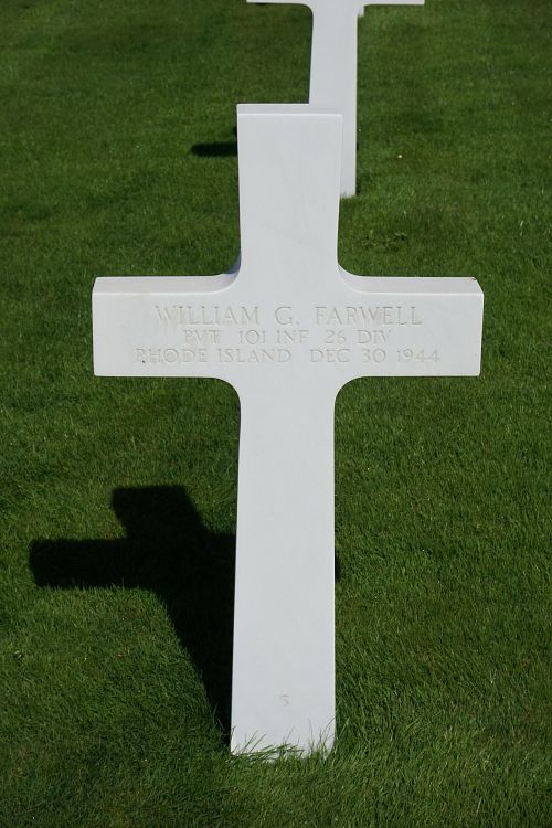 Pvt William G. Farwell attended Moses Brown School for two years before he joined the Regular Army in Ettrick, Virginia on 7 February 1939.He was first buried at the Temporary American Military Cemetery in Foy, Belgium.