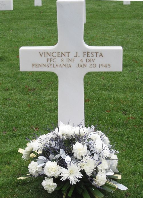 Pfc Vincent J. Festa enlisted in New Cumberland, Pennsylvania, on 24 April 1944.Source of information: Peter Schouteten, Danny van der Groen – Company’s / 4ID After Action Reports, www.abmc.gov, www.wwiimemorial.com, www.archives.gov – WWII Enlistment Record, www.ancestry.com - Headstone and Interment Record / Pennsylvania Veteran Compensation Application Files WWII / 1930 Census / U.S. WWII Draft Cards Young Men, www.findagrave.com