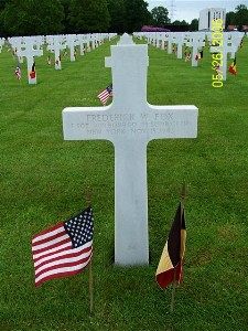 Frederick Fox, along with other crew members were buried first on the Island of Amrum at the Nebel Cemetery in Grave 53. After the war ended in Europe in April 1945, Sgt Fox and other servicemen were moved and buried at Ardennes American Cemetery in Neupre, Belgium. Frederick W. Fox was placed in Plot D, Row 11, and Grave 24.