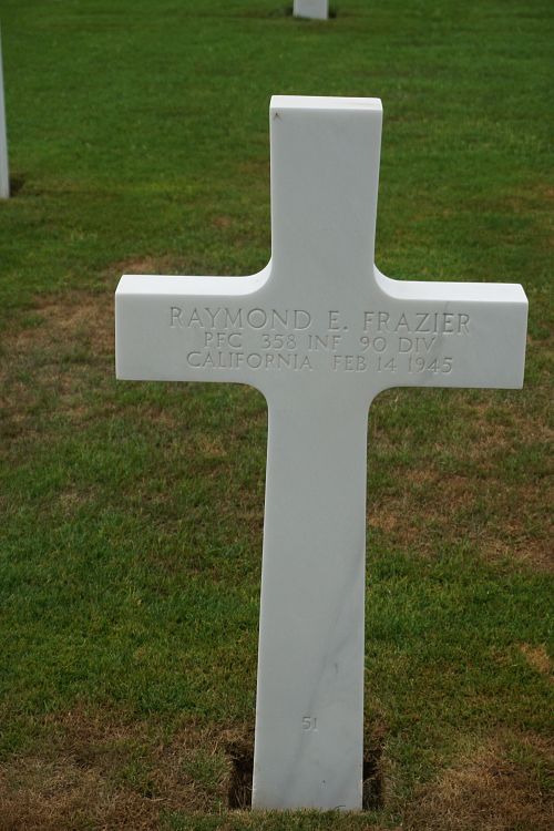 Pfc Raymond E. Frazier worked on a farm before he enlisted in Sacramento, California on 5 March 1941.Source of information: Peter Schouteten, www.abmc.gov, www.wwiimemorial.com, www.archives.gov – WWII Enlistment Record, www.ancestry.com - Headstone and Interment Record / U.S. WWII Draft Cards Young Men