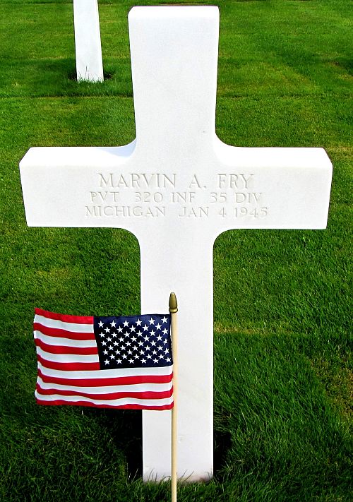 Pvt Marvin A. Fry enlisted on 19 June 1944.Source of information: Peter Schouteten, www.abmc.gov, www.wwiimemorial.com - Fellow Veteran, www.ancestry.com - Headstone and Interment Record / U.S. WWII Draft Cards Young Men / Grunwald Medsker Family Tree, After Action Report 35th Infantry Division, www.findagrave.com - MAJ Jimmy Cotton