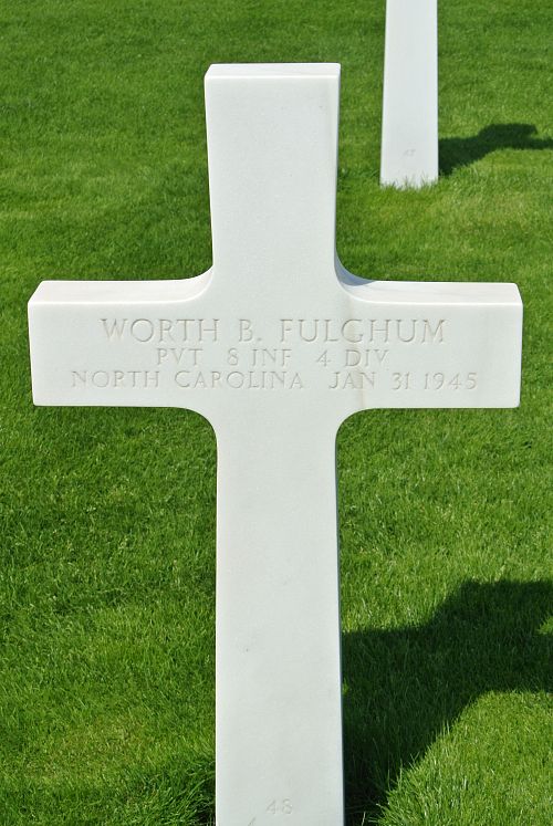 Pvt Worth B. Fulghum Sr. was a driver before he enlisted at Fort Bragg, North Carolina, on 25 May 1944.Source of information: Peter Schouteten, Company’s / 4ID After Action Reports, www.abmc.gov, www.wwiimemorial.com, www.archives.gov – WWII Enlistment Record, www.ancestry.com - Headstone and Interment Record / 1930 Census, www.findagrave.com – Ann Marie