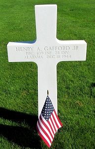 Pfc Henry A. Gafford Jr. was an attendant at a filling station and parking lot before he enlisted at Fort McClellan, Alabama on 28 November 1942.Source of information: Peter Schouteten, www.abmc.gov, www.wwiimemorial.com, www.archives.gov – WWII Enlistment Record, www.ancestry.com - Headstone and Interment Record / Jt Nelms Family Tree, www.findagrave.com