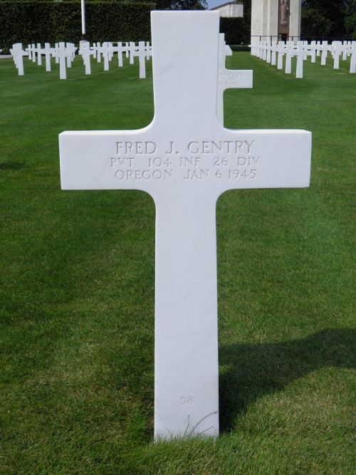 Pvt Fred J. Gentry attended high school for one year and was a driver before he enlisted in Portland, Oregon on 2 June 1943.Source of information: Peter Schouteten, www.abmc.gov, www.wwiimemorial.com, www.archives.gov – WWII Enlistment Record, www.ancestry.com - Headstone and Interment Record / U.S. WWII Draft Cards Young Men / 1930 Census / California Birth Index, www.fold3.com – 26th Infantry Division