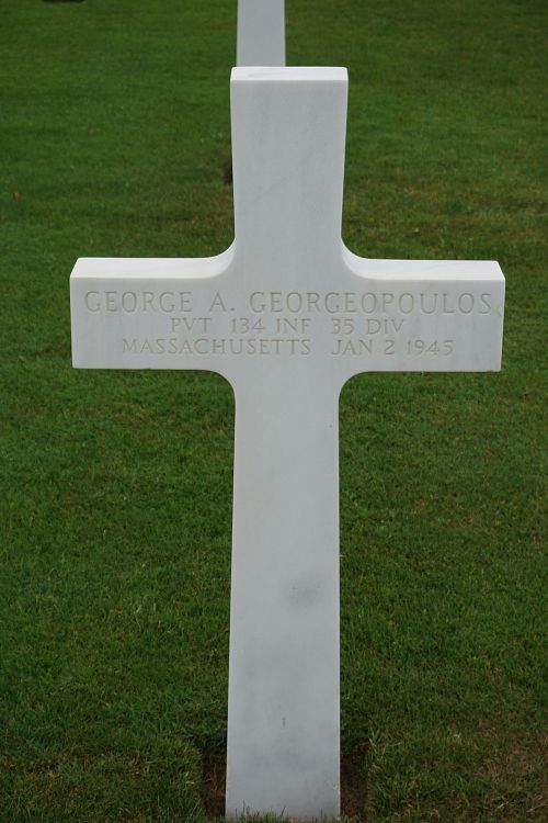 Pvt George A. Georgeopoulos graduated from Ipswich High School in 1935 and was a sales clerk before he enlisted at Fort Devens, Massachusetts on 25 April 1944.Source of information: Peter Schouteten, www.abmc.gov, www.wwiimemorial.com, www.archives.gov - WWII Enlistment Record, www.ancestry.com - Headstone and Interment Record / U.S. WWII Draft Cards Young Men / 1930 Census / Connolly Family Tree, After Action Report 35 Infantry Division