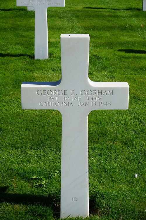 Pvt George S. Gorham was a model maker before he enlisted at Fort McArthur, California on 3 June 1944.Source of information: Leo Minne, www.abmc.gov, www.wwiimemorial.com, www.archives.gov - WWII Enlistment Record, www.ancestry.com - Headstone and Interment Record / 1930/1940 Census / Lynne's Family Tree, A footsoldier for Patton - Michael C. Bilder and James G. Bilder, The 5th Infantry Division in the ETO