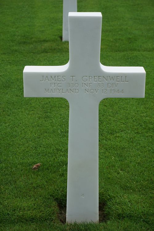 Pfc James T. Greenwell enlisted in Baltimore, Maryland, on 29 November 1943.Source of information: Peter Schouteten, www.abmc.gov, www.wwiimemorial.com, www.archives.gov – WWII Enlistment Record / World War II Prisoners of War Data File, www.ancestry.com - Headstone and Interment Record, http://83rdinfdivdocs.org, www.findagrave.com