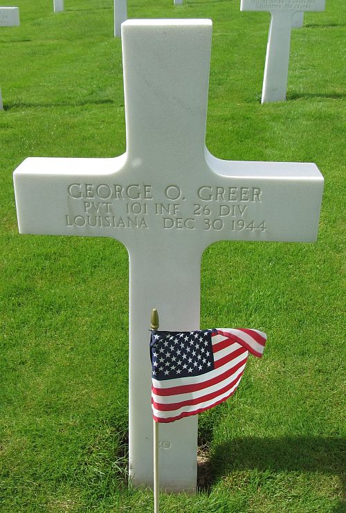 Pvt George O. Greer was a driver before he enlisted in Shreveport, Louisiana on 28 January 1943.He was killed by artillery shell fragments in his buttock and hip.