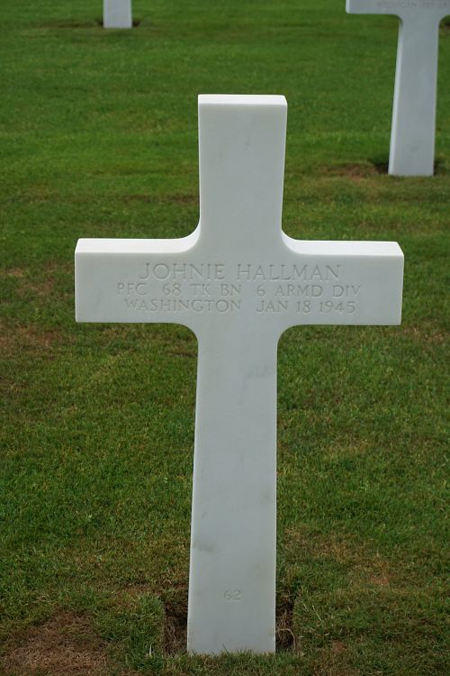 Pfc Johnie Hallman enlisted in Spokane, Washington on 12 March 1943.He was wounded in action by artillery shell fragments in the vicinity of Bizory, Belgium and died in a field hospital.