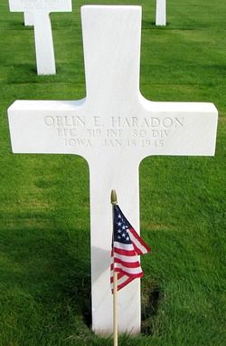 Pfc Orlin E. Haradon attended high school for one year and worked on the family farm.He was killed by artillery shell fragments in his shoulder and thigh.
