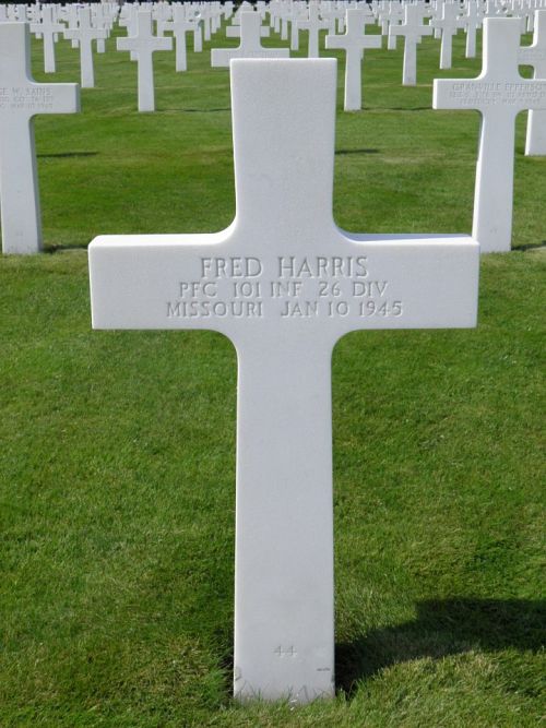 Pfc Fred Harris entered the service in 1940 and was discharged in November 1941 because of his age. He was recalled in March 1944 and left for overseas in September 1944.Source of information: Peter Schouteten, www.abmc.gov, www.wwiimemorial.com, www.ancestry.com - Headstone and Interment Record / U.S. WWII Draft Cards Young Men, www.fold3.com - 26th Infantry Division, www.findagrave.com - Thomas & Darlene