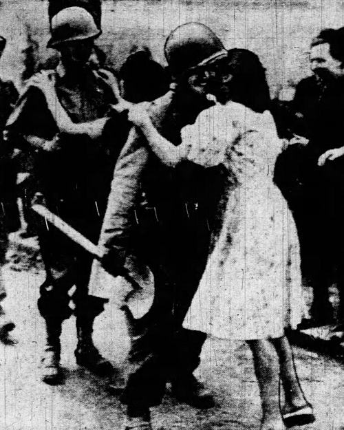 On one of the photos, Sgt Harwell is kissed by a French girl. This photo from Associated Press was published in the St Louis Globe-Democrat of 1 September 1944 with the following text: It's Sgt William H. Harwell, former Poplar Bluff, Missouri, bank teller, shown being kissed by a French girl when his unit entered Southern France. His wife, Mrs. Tass Harwell, who recognized him when this picture was printed in the globe-Democrat Sunday, says she's thrilled, too. As she was mailing a clipping, the postman handed her a letter from her husband telling her to watch for a photo showing him being "mugged by a French girl." Friends teased her, she admitted, remarking, "he must be shell shocked for holding on to that shovel in his hand." She responded: "I'm as thrilled as can be and we don't care, or at least I don't. It was a most happy thing to happen to me."