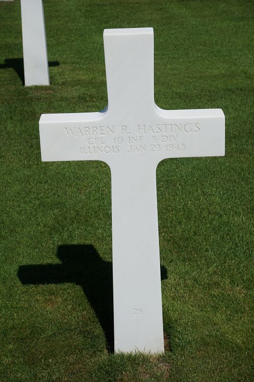 Warren R. Hastings graduated from Maroa High School and attended Millikin University.He enlisted in Peoria, Illinois on 25 May 1943. He was sent overseas in November 1944.