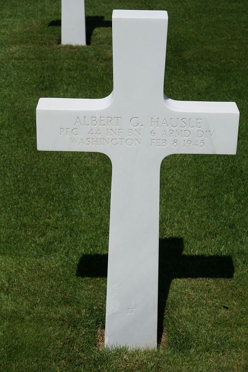 Pfc Albert G. Hausle graduated from high school and worked in defense plants on the west coast before he enlisted on 2 May 1943.Source of information: Peter Schouteten, www.abmc.gov, www.wwiimemorial.com, www.ancestry.com - Headstone and Interment Record / Hausle Wong Tree / U.S. WWII Draft Cards Young Men, www.findagrave.com, www.newspapers.com – Rapid City Journal 3 March 1945, www.super6th.org