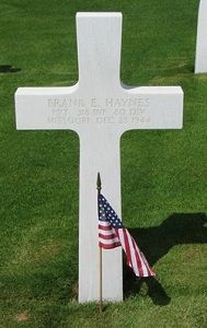 Pvt Frank E. Haynes was employed at the Percy Kent Bag Co. before he enlisted at Fort Leavenworth, Kansas on 8 May 1944. He trained at Camp Hood, Texas and Fort Benning, Georgia.He was reported seriously wounded in action by artillery shell fragments in his head on 23 December when the 2nd Battalion took positions in the vicinity of the road Niederfeulen – Ettelbruck in Germany.