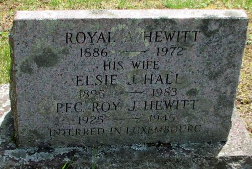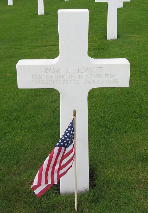 Pfc Roy J. Hewitt graduated in 1943 from Templeton High School in Massachusetts.He enlisted in Boston, Massachusetts on 6 July 1943. He was selected for the Army Specialized Training Program (A.S.T.P.) and studied civil engineering at College of Puget Sound in Oregon. When the program was abandoned, he was transferred to Camp Cook, California. He was sent overseas in October 1944.