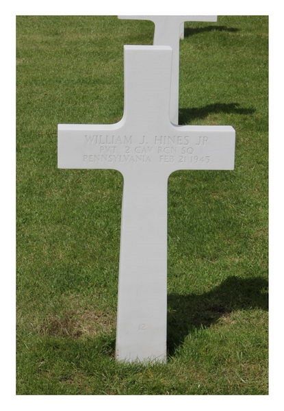 Pvt William J. Hines attended high school for two years and was employed at the Pittsburgh Water Heater Company before he enlisted at Fort George G. Meade, Maryland on 14 February 1942.He was killed by a land mine.