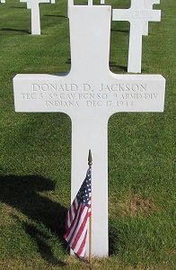 T/5 Donald D. Jackson enlisted in Toledo, Ohio on 27 October 1942. Injured in a ball game in May 1943 he did not rejoin his unit until February 1944 at Camp Polk, Louisiana after which he attended radio school at Fort Knox, Kentucky. A quiet man, Jackson was in all activities an outstanding soldier. Prevailed upon to remain in the states due to his weak ankle he waived his physical defect in order to remain with the troop when it left for Europe.He was awarded the Bronze Star Medal posthumously for his heroic efforts to save an armored car from being captured by the enemy. Although enemy fire was falling heavily all about him, he moved forward toward the enemy to move the car.