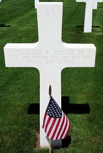 1st Lt Claude P. Jones Jr. graduated from Allen Academy and Texas A&M. He attended Texas Wesleyan College and was a brakeman with the railroad before he enlisted at Fort Des Moines, Iowa on 12 June 1942.He was awarded the Silver Star Medal. The citation cited: On 21 December 1944 during the siege of Bastogne, Belgium, he organized a platoon of thirty men which he placed in a defensive position under heavy enemy fire. Lieutenant Jones personally placed his men in firing positions, procured weapons and blankets for those only partially equipped and visited their positions several times during the night to encourage his men. When the enemy launched a heavy attack, Lt Jones again exposed himself to heavy enemy fire in order to instill in his men confidence and courage. During this action, he was mortally wounded by enemy fire. His skillful leadership, courage and devotion to duty were an inspiration to his men.