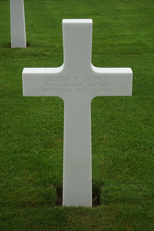 Pvt Elmer T. Jones worked in a machine shop before he enlisted in Los Angeles, California on 15 March 1943.Source of information: Leo Minne, www.abmc.gov, www.wwiimemorial.com, www.ancestry.com - Headstone and Interment Record / 1930/1940 Census / U.S. WWII Hospital Admission Card Files / U.S. Draft Cards Young Men, www.80thdivision.com
