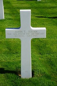 Pfc John T. Julian enlisted at Fort McClellan, Alabama on 20 May 1943.Pfc Julian was killed by a gunshot in the neck during a patrol in Bois Jacques on 21 December 1944. Apparently the official date of death was incorrectly registrered and referenced the date of his temporary burial.