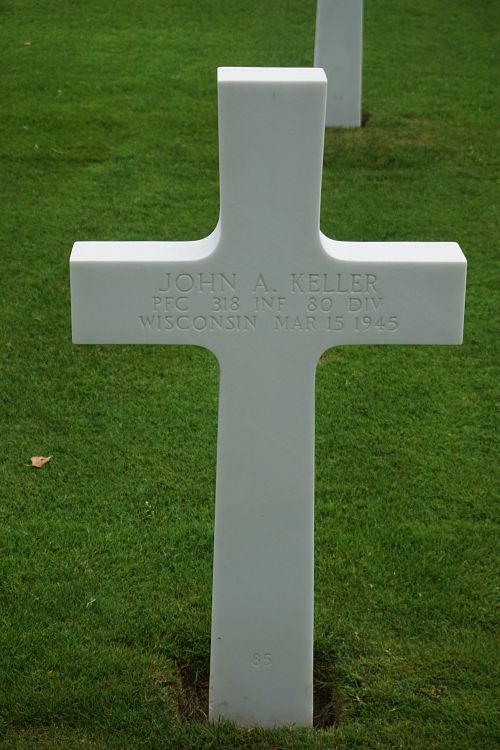 Pfc John A. Keller graduated from St. Mary’s School and was employed by the U.S. Chicago and Nort Western Railroad Co. before he enlisted on 28 June 1944. He trained at Camp Croft, South Carolina and went overseas just before Christmas 1944.He was killed by small arms fire in the head.