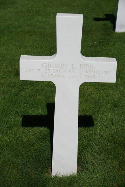 T/5 Gilbert L. Kirk was a miner and mining-operator before he enlisted at Fort McPherson, Georgia on 18 March 1942. He had served 15 months overseas.Source of information: Peter Schouteten, www.abmc.gov, www.wwiimemorial.com, www.archives.gov - WWII Enlistment Record, www.ancestry.com - Headstone and Interment Record / U.S. WWII Draft Cards Young Men / 1930 Census, www.findagrave.com - Annette Bradford