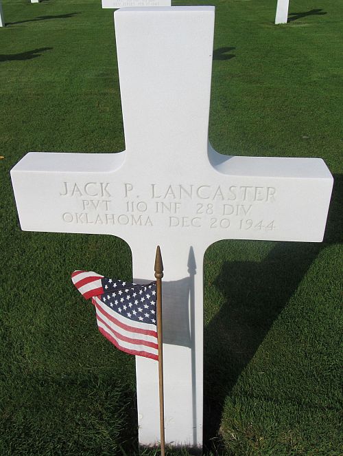 Pvt Jack P. Lancaster worked on a farm before he enlisted at Fort Sill, Oklahoma on 6 April 1944.Source of information: Peter Schouteten, www.abmc.gov, www.wwiimemorial.com, www.archives.gov β WWII Enlistment Record, www.ancestry.com - Headstone and Interment Record, www.findagrave.com