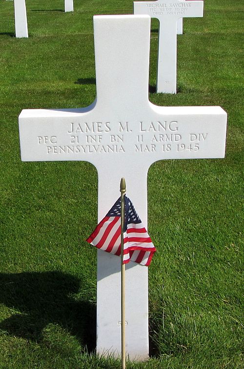 Pfc James M. Lang enlisted in Altoona, Pennsylvania on 4 November 1942. He received his training at Camp Polk, Louisiana, Camp Maxey, Texas, Camp Cook, California and Camp Kilmer, New Jersey.Source of information: André Koch, www.abmc.gov, www.wwiimemorial.com, www.archives.gov – WWII Enlistment Record, www.ancestry.com - 1920/1930/1940 Census / Headstone and Interment Records / U.S. WWII Draft Cards Young Men, 1940-1947 / Pennsylvania, Veteran Compensation Application Files, WWII, 1950-1966, http://www.11tharmoreddivision.com