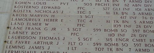 Pfc Roy Larney was officially declared dead one year and one day after he was reported missing and was presumed dead. At that time his unit was fighting in the vicinity of Wiltz.Source of information: Peter Schouteten, www.abmc.gov, www.wwiimemorial.com, www.ancestry.com – U.S. WWII Draft Cards Young Men